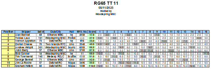 Woodspring Model Sailing Club (MSC) near Bristol hosted the final two rounds of the 2025 RG65 Traveler’s Trophy (TT) series over the weekend of 8th and 9th November. Thirteen sailors entered and eleven made it to the start line on both days. It was great to see a range of established designs (Ivy, Uno, Scurry, Scuttle) entered alongside some new developments. Tobias Laux (161) tested a new 3D printed prototype (Proto0), while a new promising looking design based on an existing successful Marblehead (F6) was trialled by Jim La Roche (57) and Graham Hetem (60).